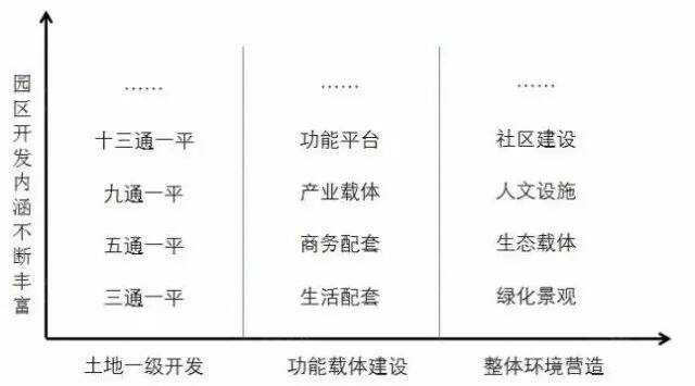 随着时代的变迁和经济的发展,企业对园区的需求越来越具体化、多元化,单纯的土地批租已不能满足企业的需求,因此,园区开发主体不断探索出多样化、个性化的开发内容。纵览整个园区经济发展历程,总结园区开发的各种建设活动并结合多年的产业园区开发策划从业经验,将园区开发分为土地一级开发、功能载体建设和整体环境营造三个层次。